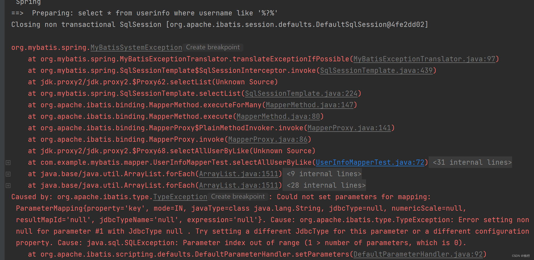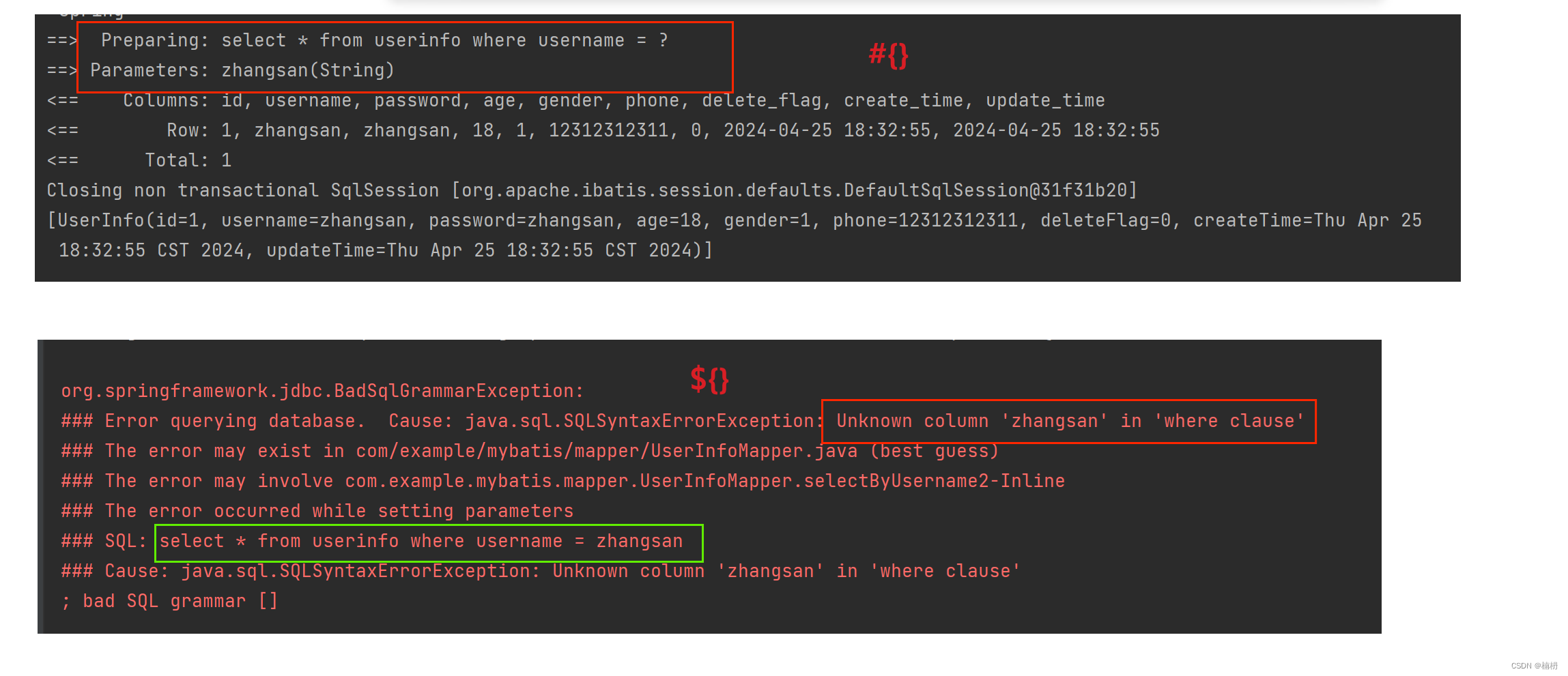 当使用 ${} 时,由于参数直接拼接在SQL语句中,而字符串作为参数时需要添加 '',而 ${} 不会拼接'',因此程序报错