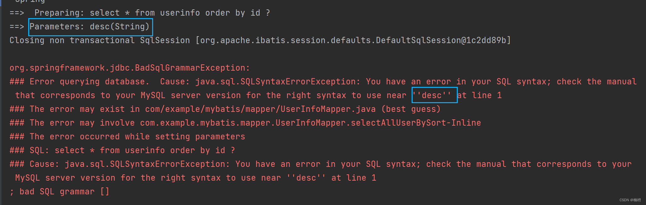 由于 参数类型为 String,desc 被自动加上了 '',因此导致 sql 错误