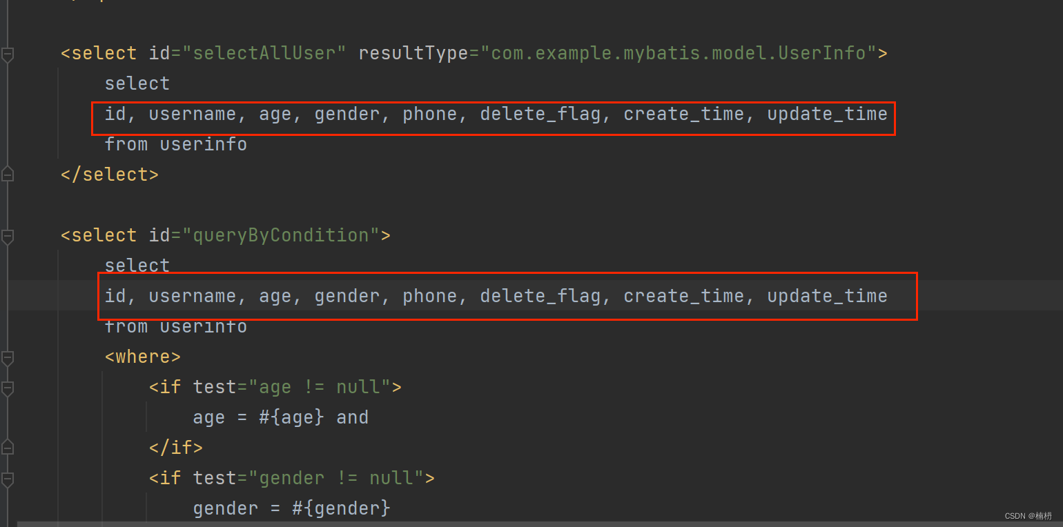 此时,我们可以对重复的代码片段进行抽取,将其通过 <sql> 标签封装到一个 SQL 片段,再通过 <include> 标签进行引用
