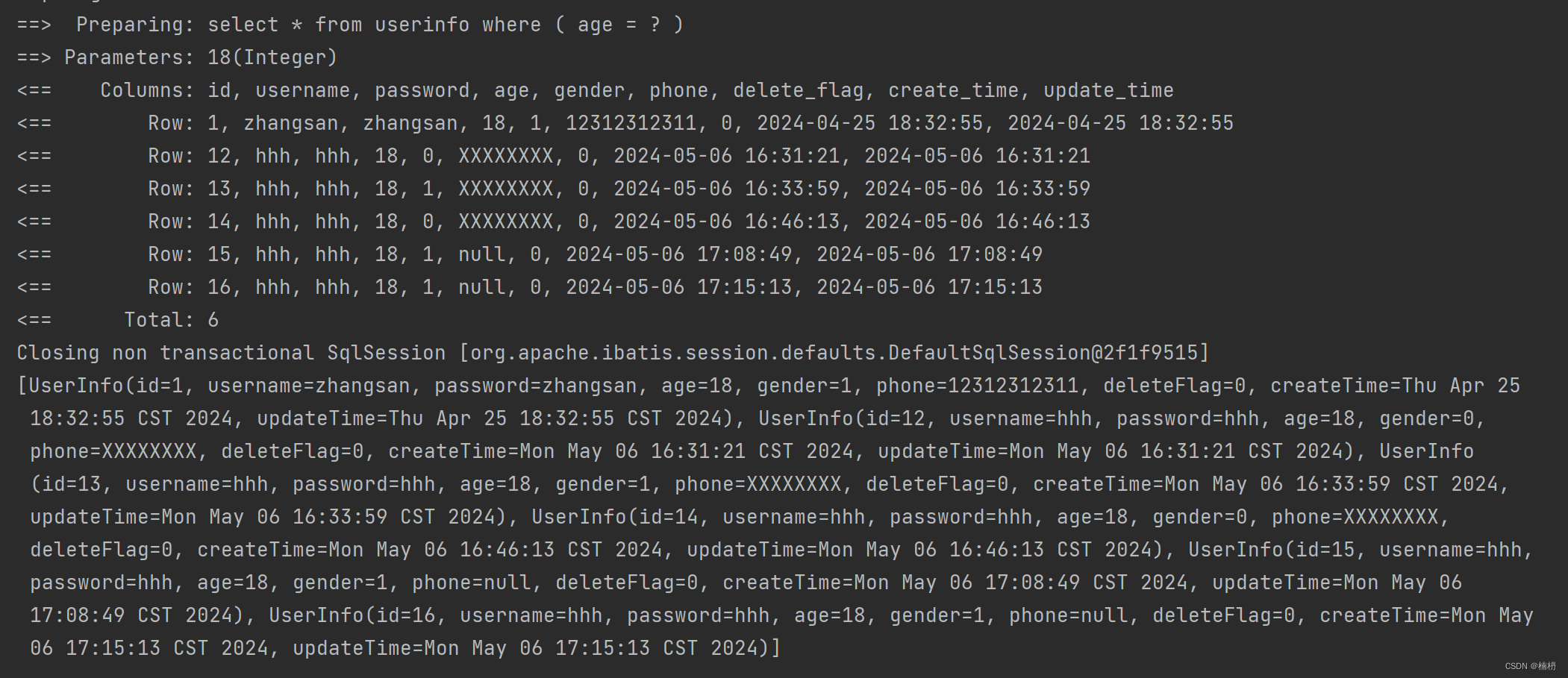 此时查询条件为 age = 18,从运行结果中我们可以看到,所以 age = 18 的数据被查找到