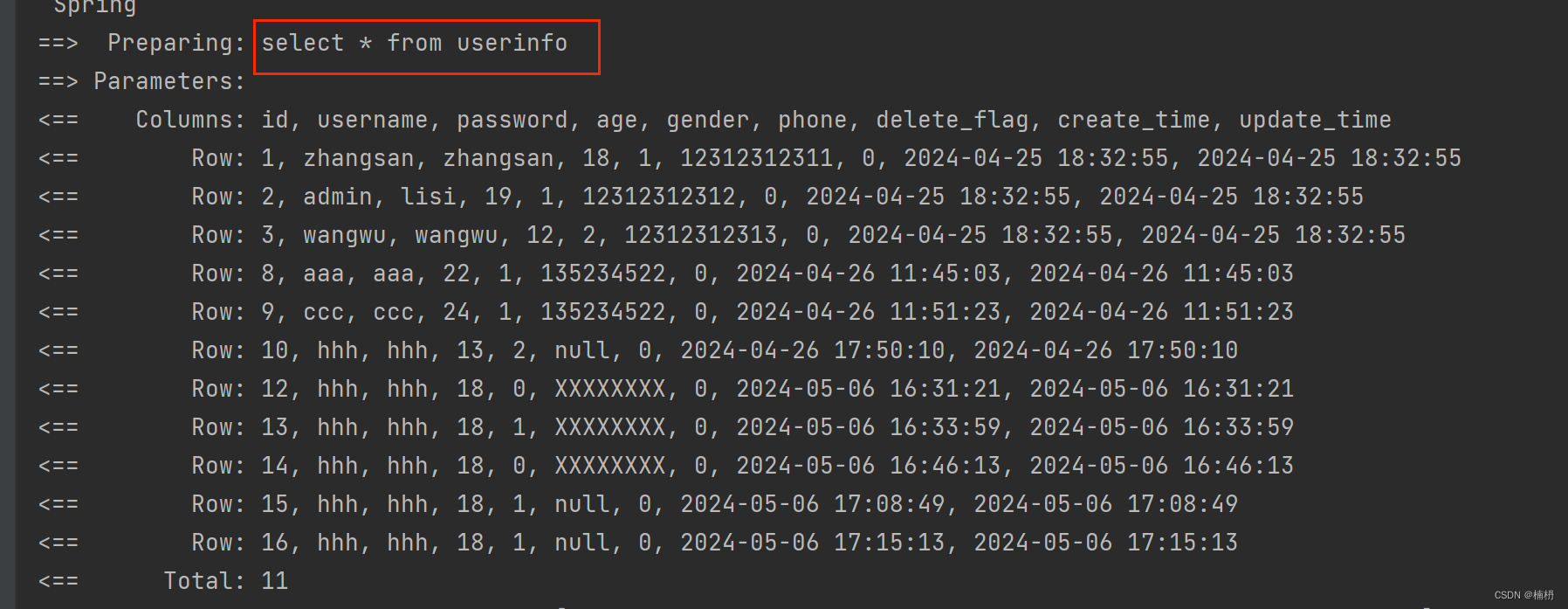 id, username, age, gender, phone, delete_flag, create_time, update_time