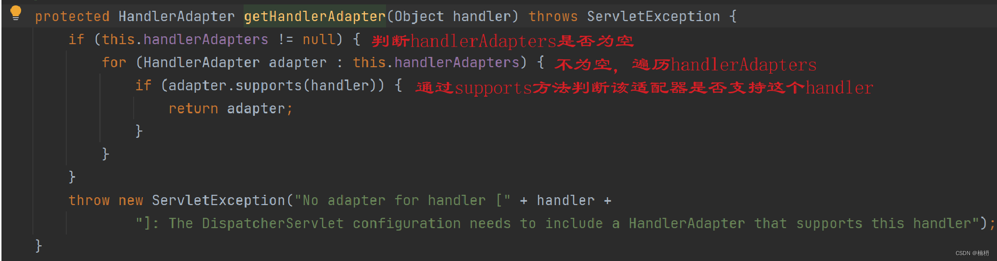 在getHandlerAdapter中,通过supports方法寻找合适handler的适配器,并返回