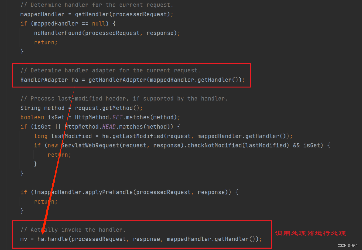 doDispatch 先找到与请求对应的handler,再调用 getHandlerAdapter,找到可以处理该handler的HandlerAdapter