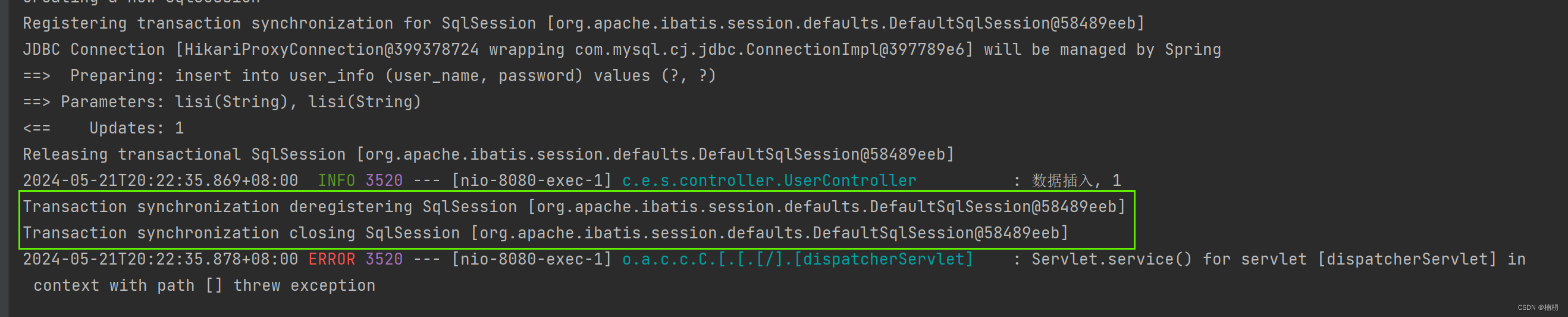 (3)然后registry调用 logService.insertLog 方法,向 log_info 插入一条数据(插入成功),但由于出现了异常,因此执行失败(使用新开启的事务)