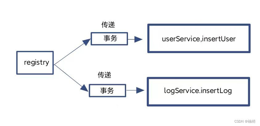 registry 事务可以认为是父事务,嵌套事务是子事务,父事务出现异常,子事务也会回滚,子事务出现异常如果不进行处理,也会导致父事务回滚
