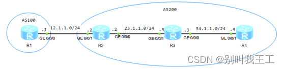 - 配置BGP R1与R2建立EBGP的邻居关系,R2与R3、R3与R4为IBGP的邻居关系。