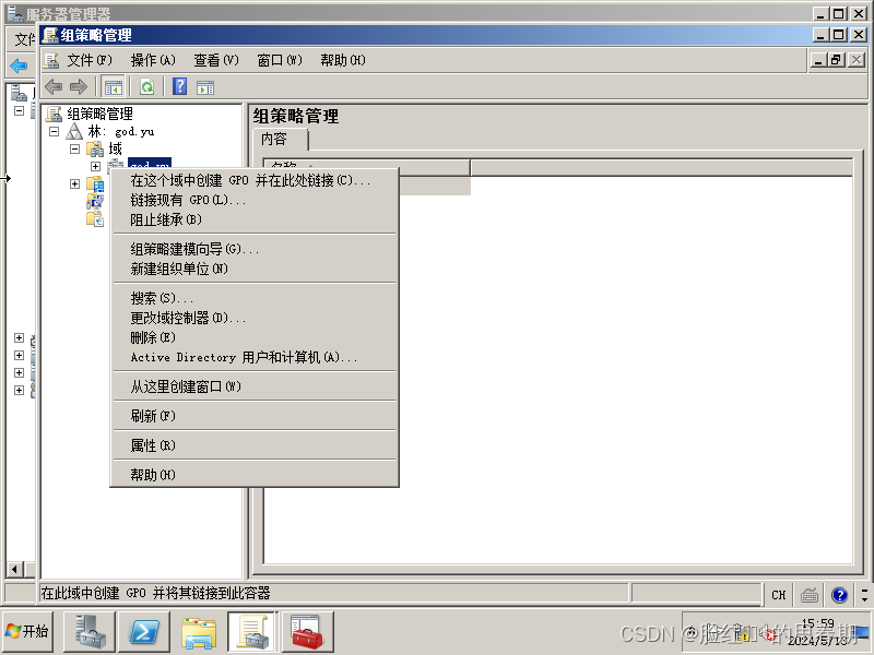开始-》管理工具-》组策略-》林-》域-》右击域-》创建GPO