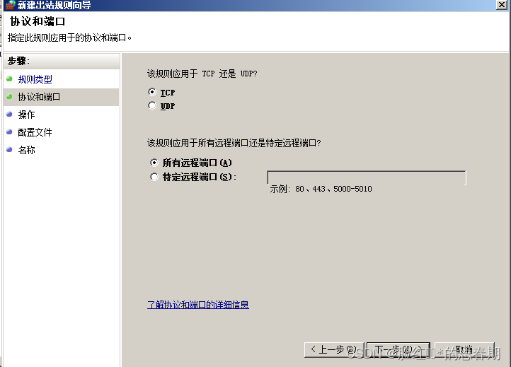 但是我现在把tcp流量出站全部封杀,也就是tcp的流量无论从那个端口都出不去。点击出站规则,右键新建规则,选择端口。
