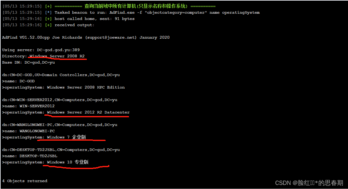 查询当前域内的主机,可以看到当前域内有四台主机,分别是server2008、server2012、win10、win7。