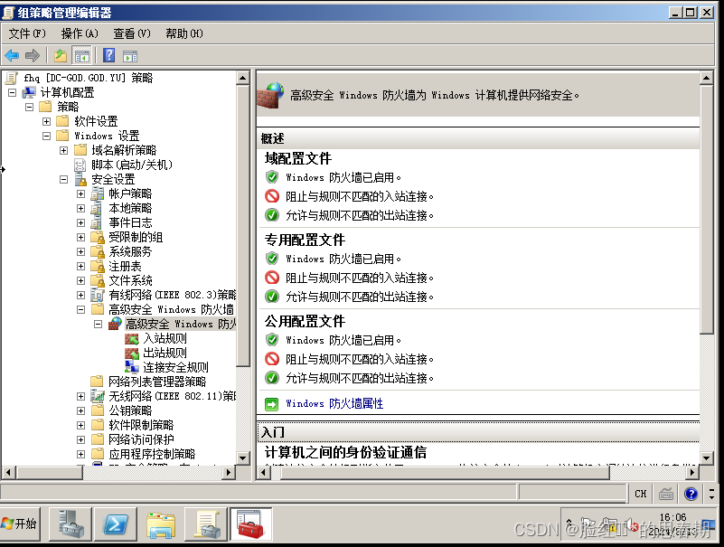 现在我们就来试试DC设置防火墙规则然后下发到域内主机,我们先到域内主机确保我们的防火墙是开的。