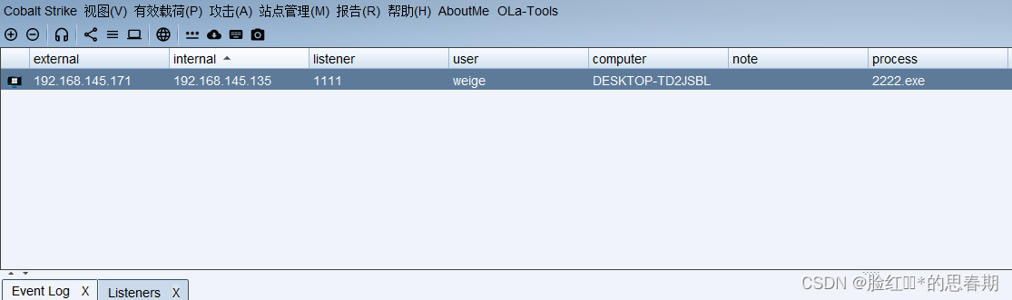 也是成功上线好吧,而且我们可以看到上线的监听器是1111,而我们生成木马的监听器却是2222。为啥会这样子呢,我们用监听地址为127.0.0.1的监听器生成木马,那么这个木马的流量就不会走出去,一直在原地转圈嘛。然后我们又运行了pingtunnel,让它把本地127.0.0.1:4444的tcp流量封装成icmp流量,再转发到192.168.145.171:3333嘛。如果我们直接用1111监听器生成木马,那么它流量不就想走到192.168.145.171去了嘛,但是我们又封杀了tcp走不出去,所以也就无法上线。