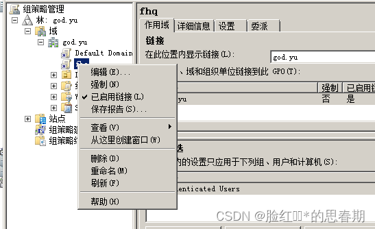 然后就是对组策略的编辑,打开组策略管理,找到我们刚刚新建的GPO,我这里的名字是fhq