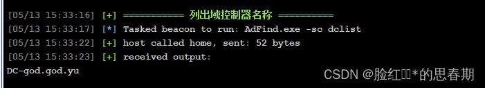 在你历经千辛万苦终于到达内网之后,面对一个陌生的域,首先肯定是进行信息收集嘛。主机探测、密码抓取等。这里假设我们已经获取了一台内网主机的shell,那我们怎么判断这个主机是不是在域内呢。最简单的命令,如果在域内的话会返回域的名称和DC的时间。这里可以看出主机在god.yu域内。