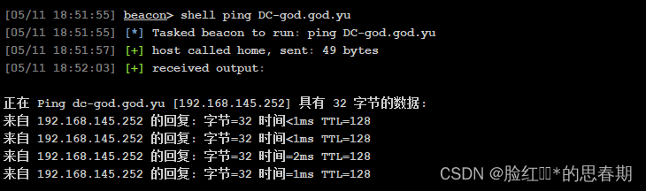 现在我们已经知道主机在god.yu中了,然后我们还可以知道DC的ip地址,直接ping这个域即可