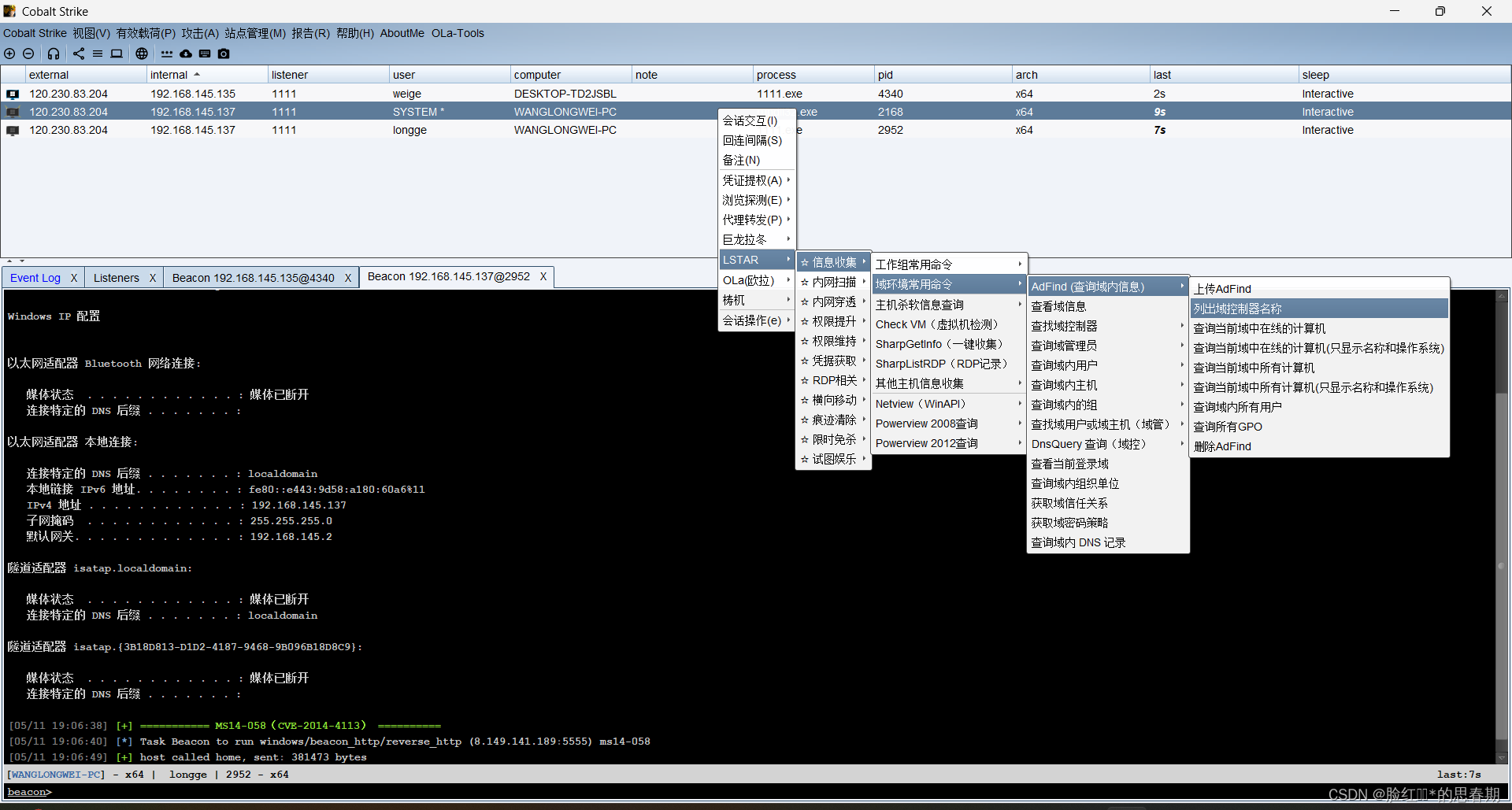 对域的信息收集其实就是域命令的使用,感兴趣的可以搜一下,这里我直接上工具来信息收集啦。毕竟有工具谁还想一个一个命令地敲。这里用cs的插件进行域信息收集,这些插件超级猛,还方便。