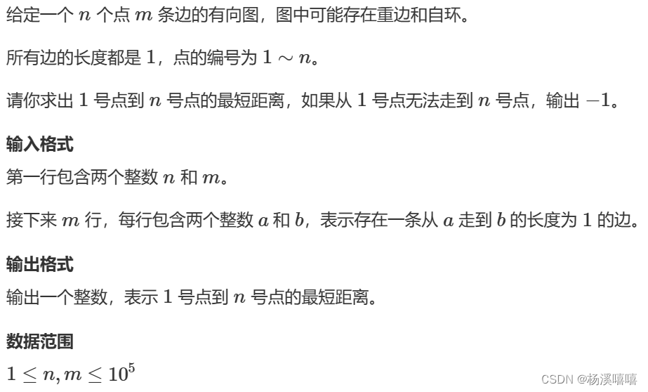 【C++算法】树的层次(树的BFS) 从1走到n的最短距离,可以用图的bfs做,用一个队列,初始时,1入队,再将1的邻边入队,用数组d[N]表示距离,先初始化所有的点为-1,d【0】 = 1,如果此点没被更新,则被当前节点更新,避免重边和自环。