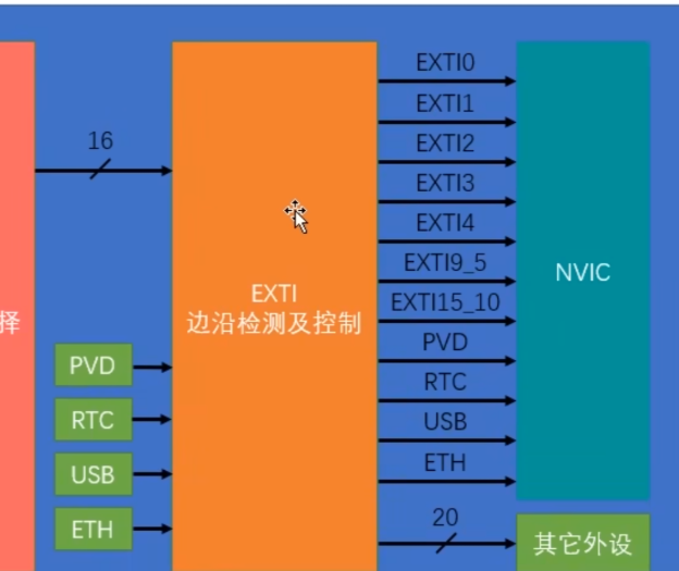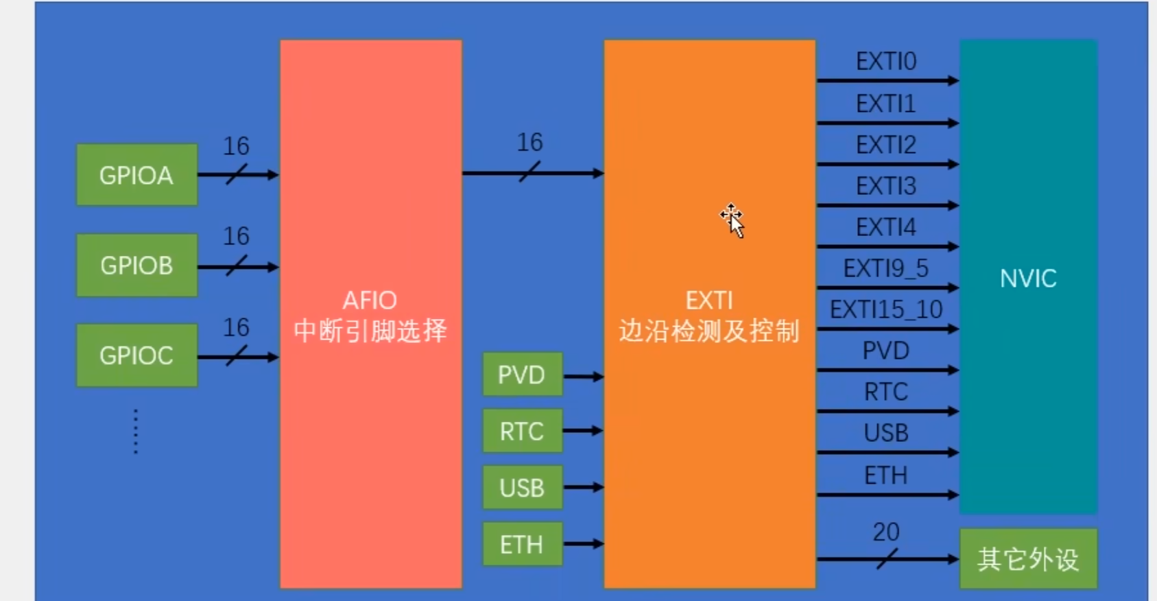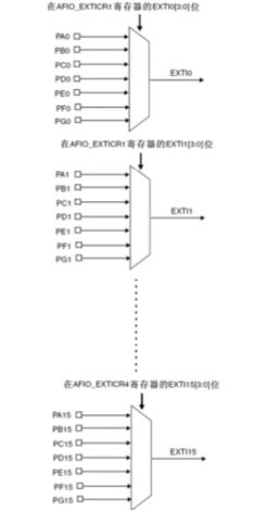 由于EXTI只有16路通道,但是GPIOA+GPIOB+……引脚数量肯定大于16