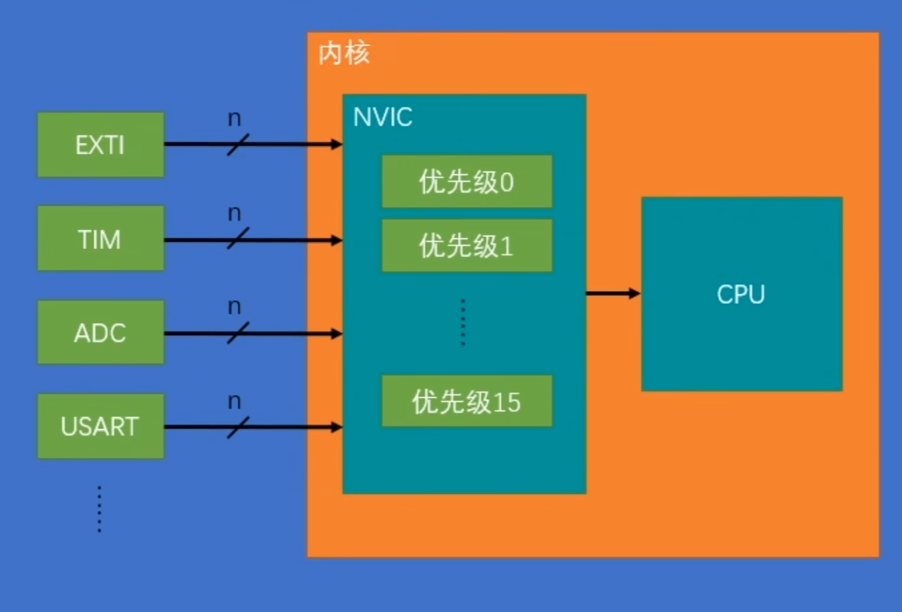 多个外设都会触发中断,在NVIC通过优先级来判断先执行哪个,n是一个外设还可以多个通道