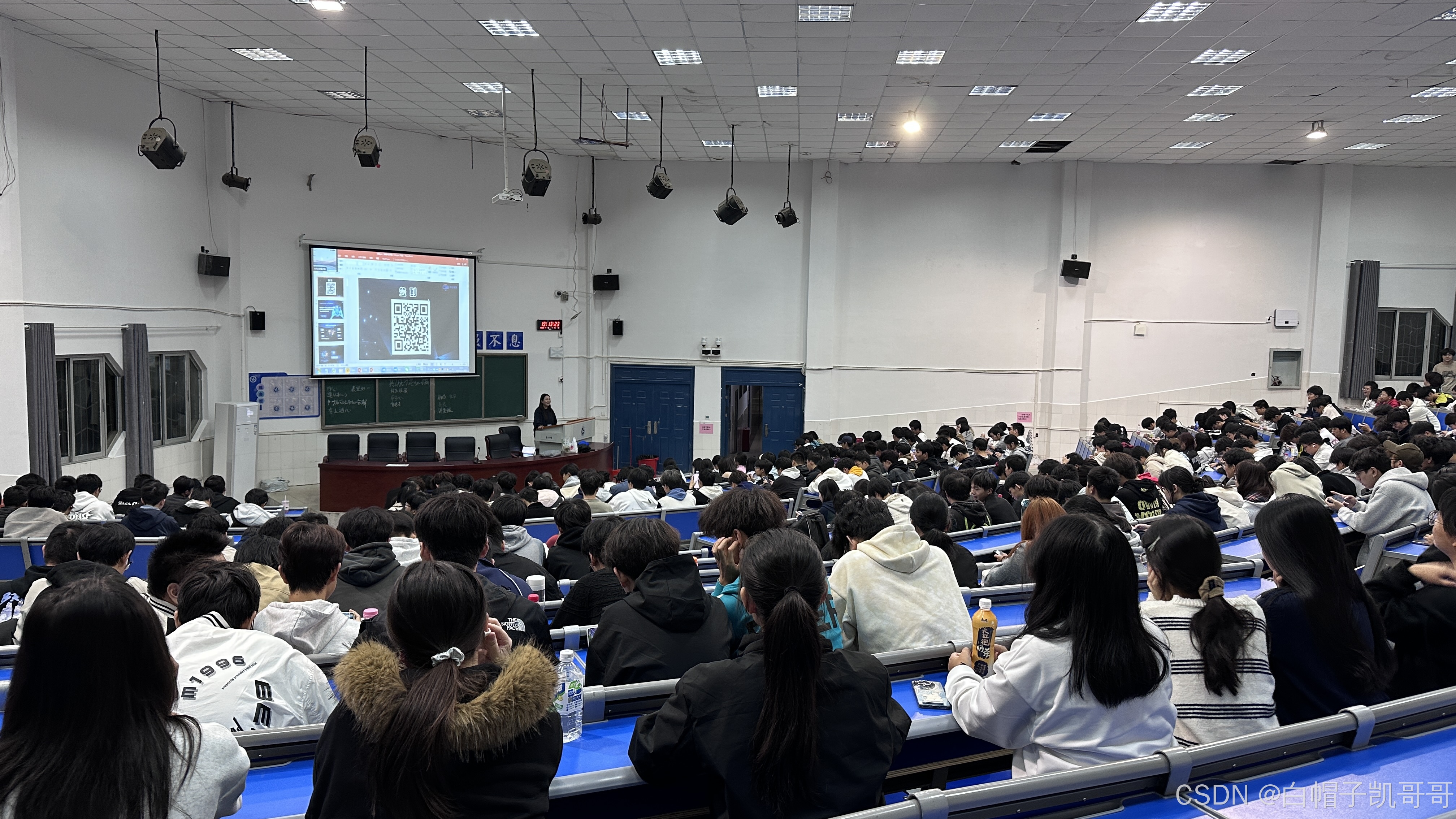 公开课在同学们热烈的掌声中拉开帷幕。湖南科技学院计算机学院的领导首先对省网安基地专家团的到来表示热烈欢迎,本次活动吸引了多个学院的近七百名学子。大教室座无虚席,后排和走道都站满了热情的学生,充分展现了当代大学生对网络安全这一前沿领域的高度关注。