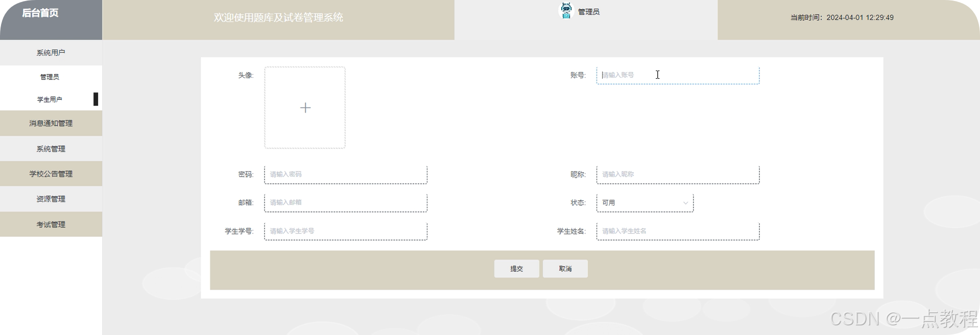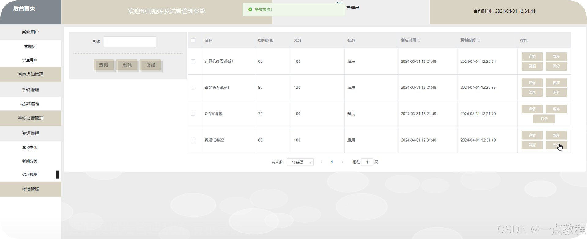 - 后台后台首页:后台首页提供了试卷平均分统计和考试成绩统计,帮助管理员全面了解学生的学习情况和表现。