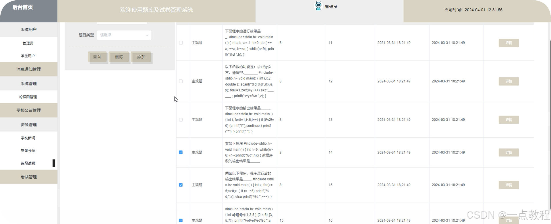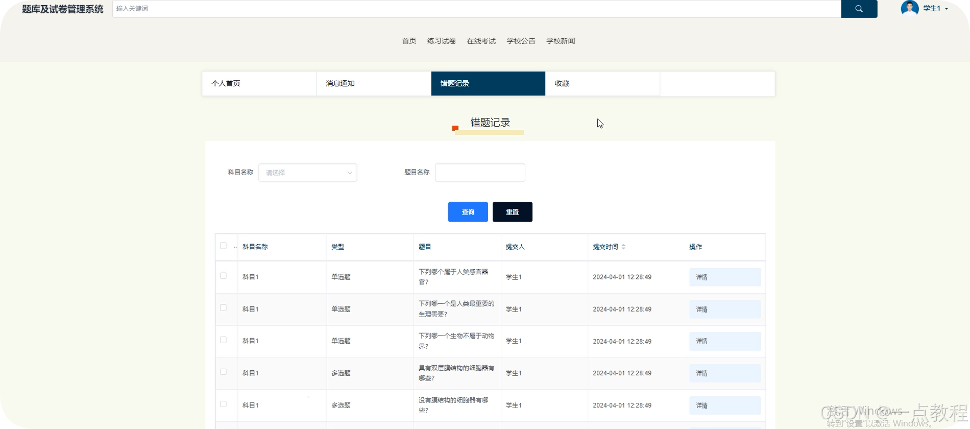 - 考试管理:管理员可以管理系统内的考试流程,包括科目列表、试题库、错题记录和试卷列表,确保考试过程的顺利进行。