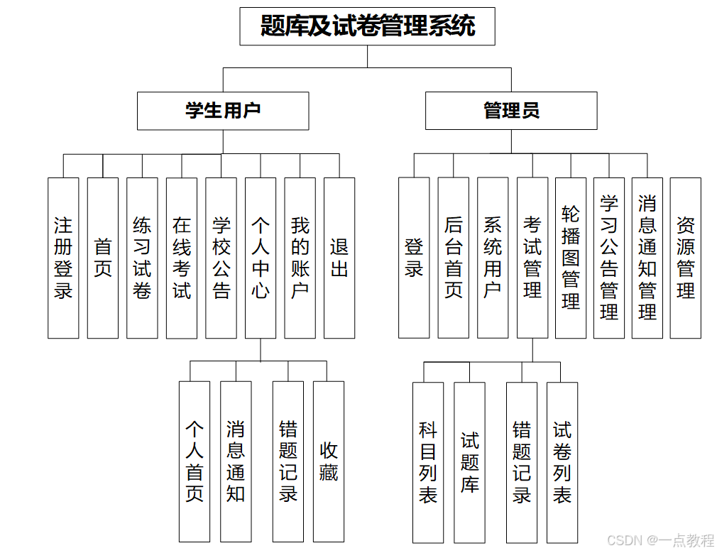 题库及试卷管理系统提供了普通用户和管理员两个角色的功能。普通用户可以在首页获取题库及试卷资源,参与在线考试,练习试卷、个人学习记录。管理员则能够管理系统用户,监控学习记录,管理轮播图,以及管理在线考试。通过该系统,用户可以方便地学练习、进行考试评估,并实时跟踪自己的学习进度,而管理员可以有效管理用户和系统内容,确保系统的正常运行。具体功能分析如下: