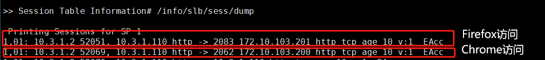 Alteon会话表在Chrome访问的会话给到了172.10.103.200,在Firefox访问的会话给到了172.10.103.201