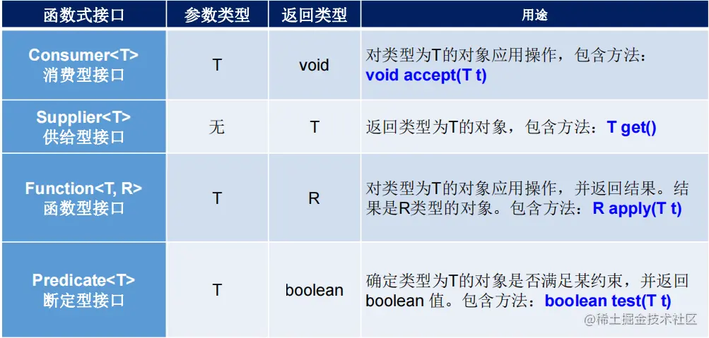 Predicate<T> boolean test(T t)有参,但是返回值类型是固定的boolean;- 函数型接口: