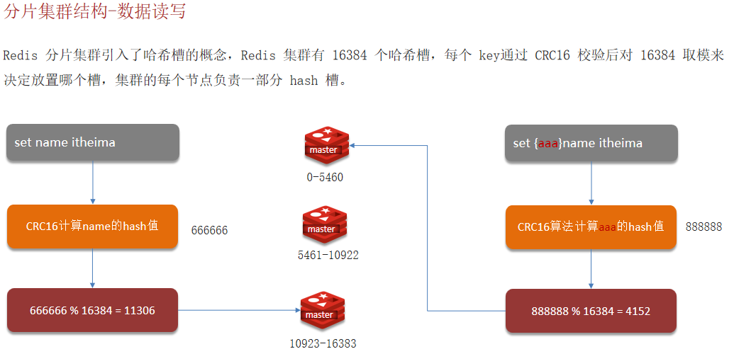 Redis 集群引入了哈希槽的概念,有 16384 个哈希槽,集群中每个主节点绑定了一定范围的哈希槽范围,key通过CRC16校验后对16384取模来决定放置哪个槽,通过槽找到对应的节点进行存储。