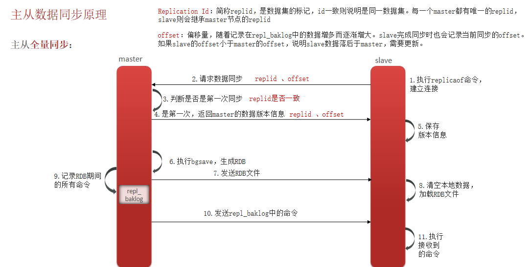 第一:从节点请求主节点同步数据,其中从节点会携带自己的replication id和offset偏移量。