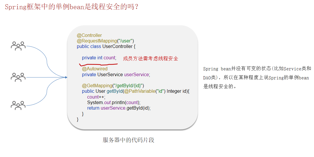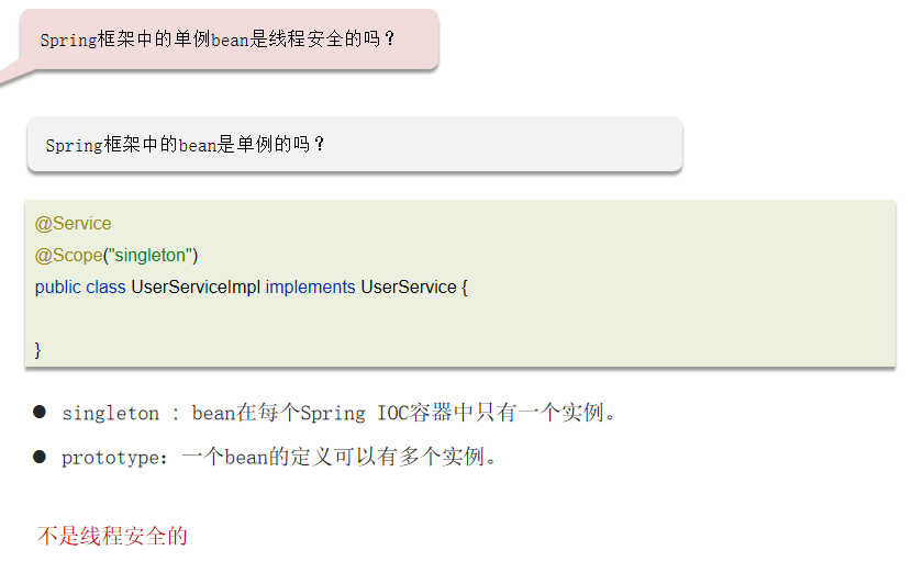 通常在项目中使用的Spring bean是不可变状态(如Service类和DAO类),因此在某种程度上可以说Spring的单例bean是线程安全的。如果bean有多种状态(如ViewModel对象),就需要自行保证线程安全。最简单的解决办法是将单例bean的作用域由“singleton”变更为“prototype”。