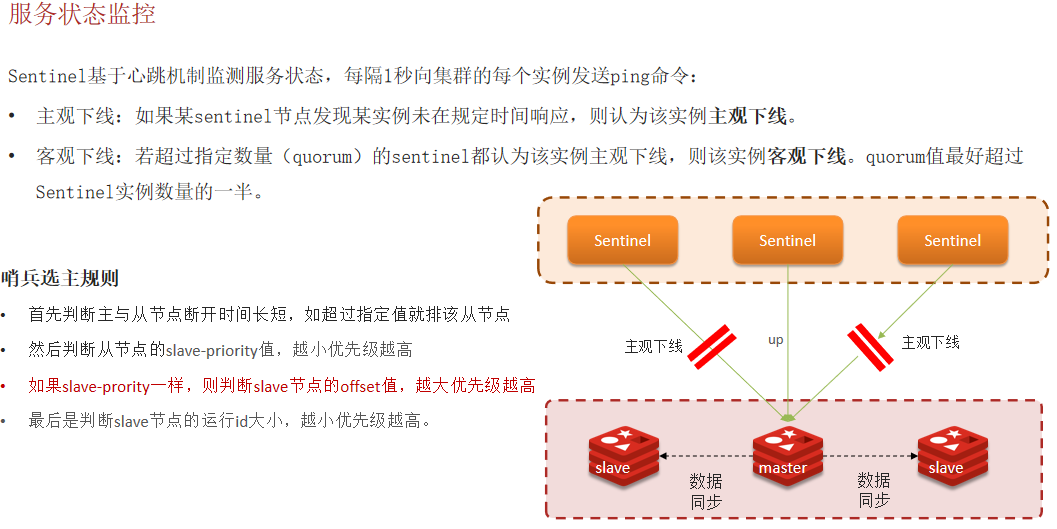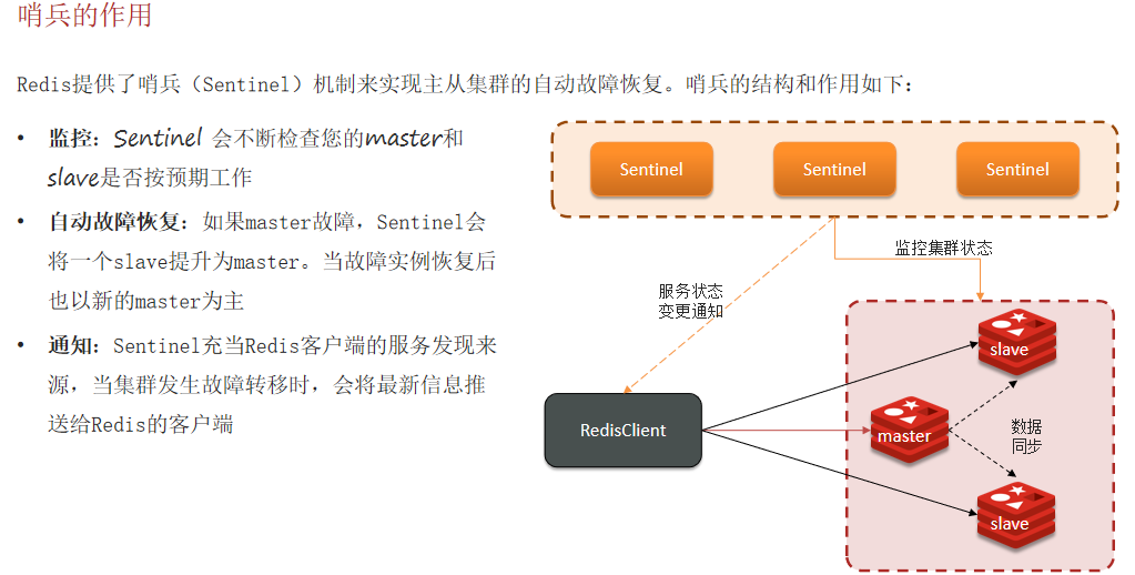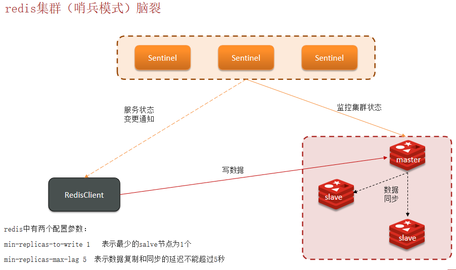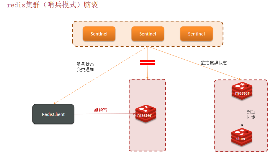 有的时候由于网络等原因可能会出现脑裂的情况,就是说,由于Redis master节点和Redis slave节点和Sentinel处于不同的网络分区,使得Sentinel没有能够心跳感知到master,所以通过选举的方式提升了一个slave为master,这样就存在了两个master,就像大脑分裂了一样,这样会导致客户端还在old master那里写入数据,新节点无法同步数据,当网络恢复后,Sentinel会将old master降为slave,这时再从新master同步数据,这会导致old master中的大量数据丢失。