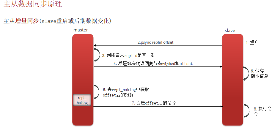 增量同步指的是,当从节点服务重启之后,数据就不一致了,所以这个时候,从节点会请求主节点同步数据,主节点还是判断不是第一次请求,不是第一次就获取从节点的offset值,然后主节点从命令日志中获取offset值之后的数据,发送给从节点进行数据同步。