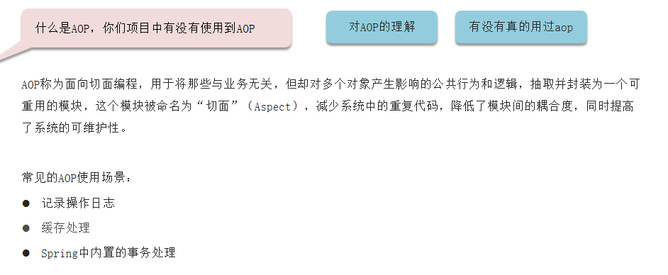 AOP,即面向切面编程,在Spring中用于将那些与业务无关但对多个对象产生影响的公共行为和逻辑抽取出来,实现公共模块复用,降低耦合。常见的应用场景包括公共日志保存和事务处理。
