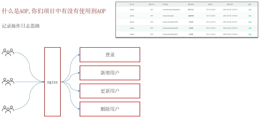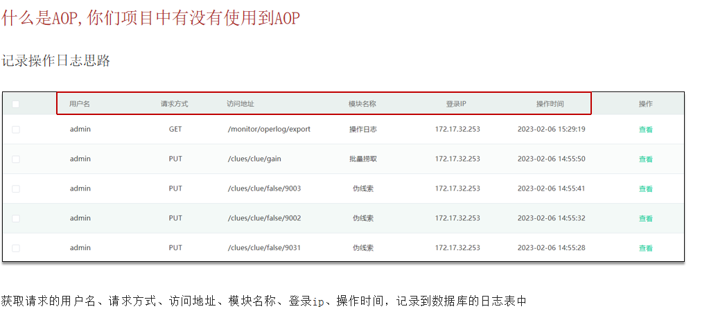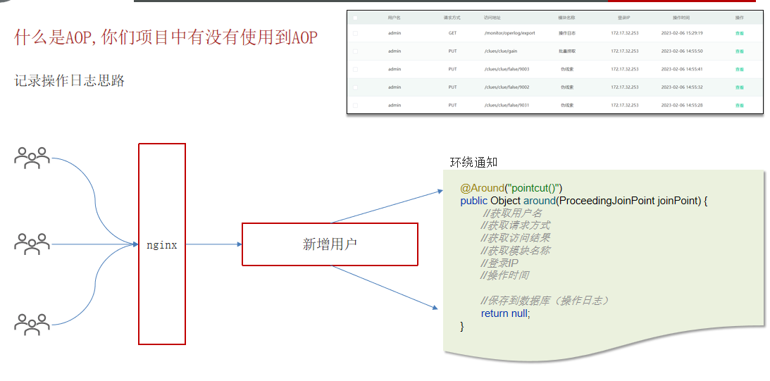 我们之前在后台管理系统中使用AOP来记录系统操作日志。主要思路是使用AOP的环绕通知和切点表达式,找到需要记录日志的方法,然后通过环绕通知的参数获取请求方法的参数,例如类信息、方法信息、注解、请求方式等,并将这些参数保存到数据库。
