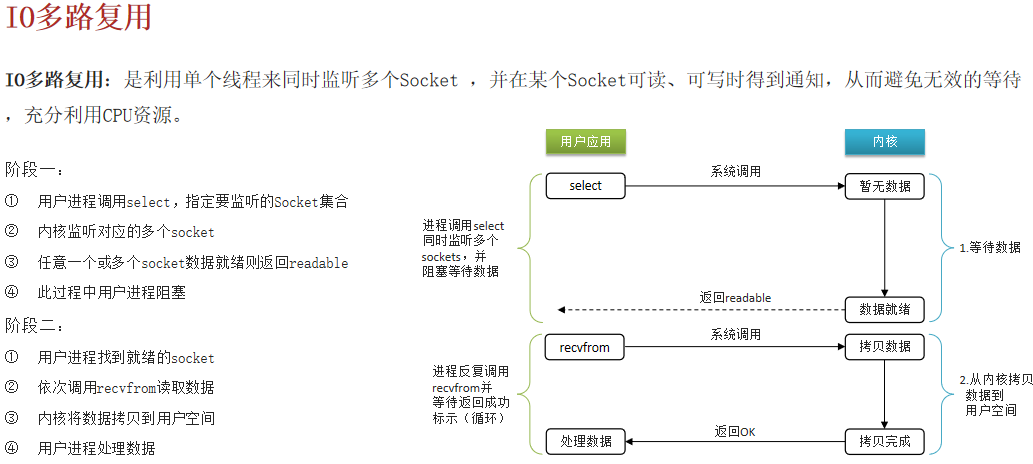 候选人:嗯~~,I/O多路复用是指利用单个线程来同时监听多个Socket,并且在某个Socket可读、可写时得到通知,从而避免无效的等待,充分利用CPU资源。目前的I/O多路复用都是采用的epoll模式实现,它会在通知用户进程Socket就绪的同时,把已就绪的Socket写入用户空间,不需要挨个遍历Socket来判断是否就绪,提升了性能。