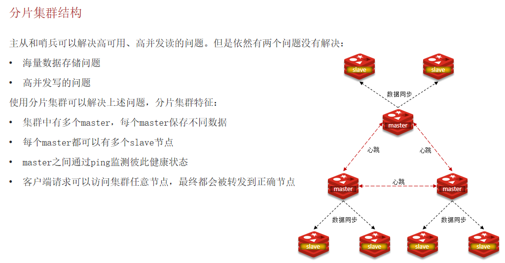 候选人:分片集群主要解决的是海量数据存储的问题,集群中有多个master,每个master保存不同数据,并且还可以给每个master设置多个slave节点,就可以继续增大集群的高并发能力。同时每个master之间通过ping监测彼此健康状态,就类似于哨兵模式了。当客户端请求可以访问集群任意节点,最终都会被转发到正确节点。