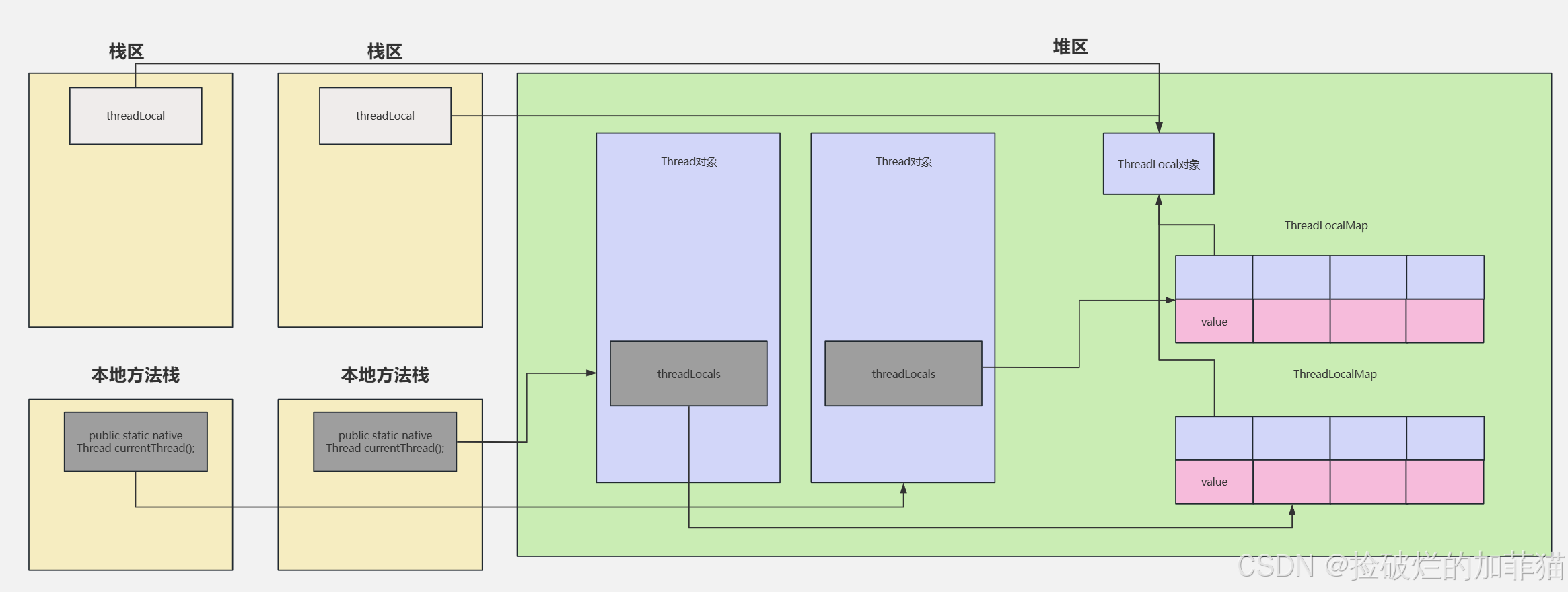 尽管threadLocal引用的是堆区中的同一个ThreadLocal对象,但是由于ThreadLocalMap不同,那么存储与取出的value值互不影响,实现线程独立性。