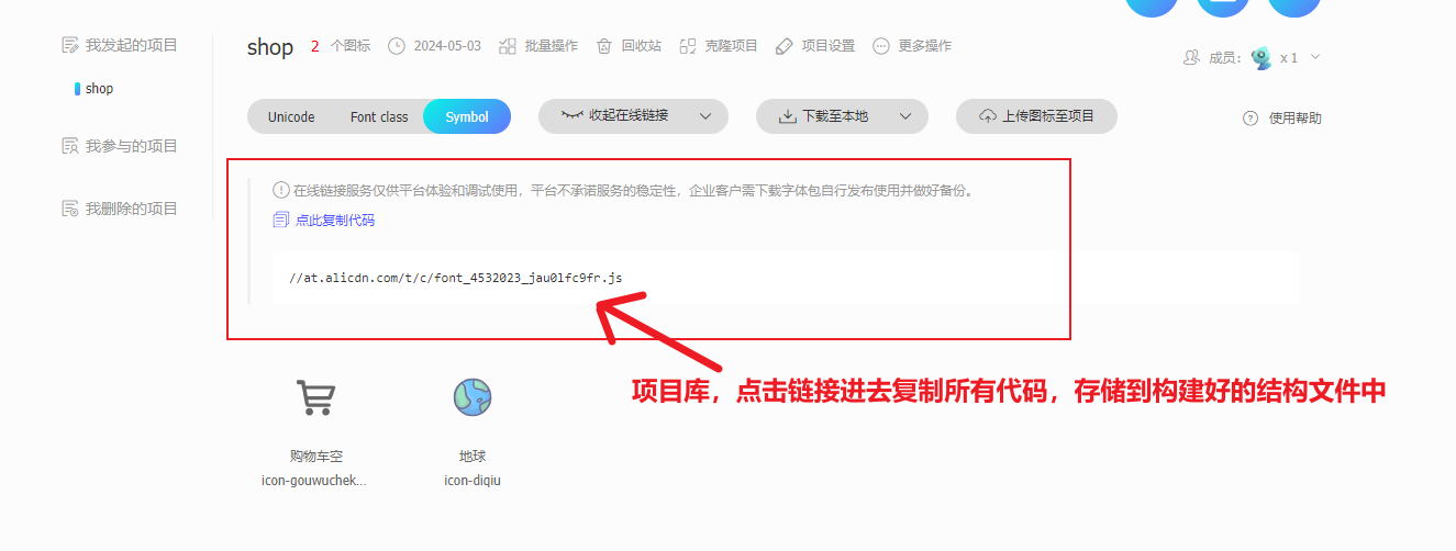 - Symbl就切换到Symbo栏,粘贴js到iconfont.js文件