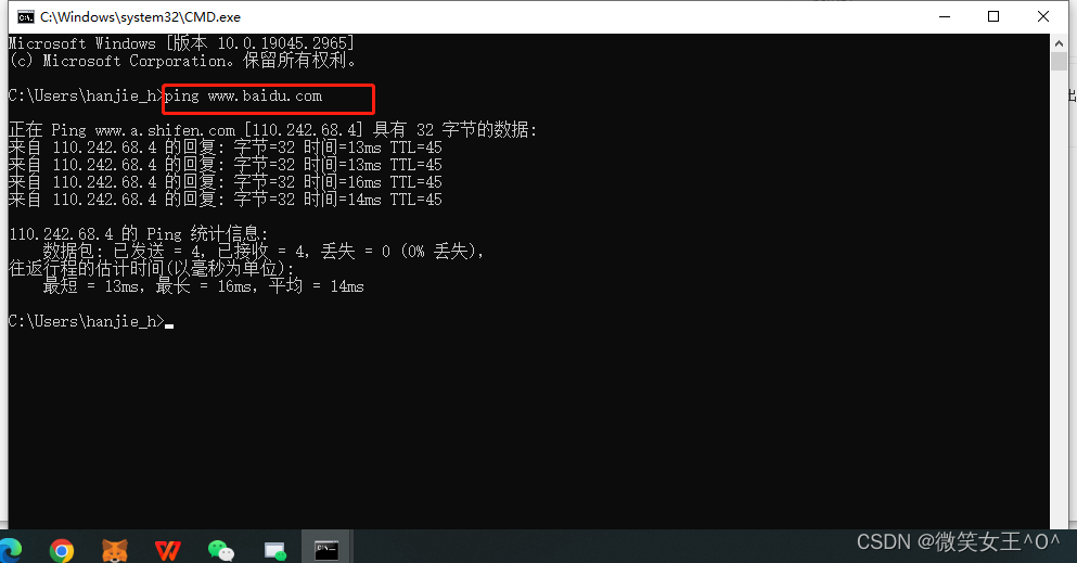 3.输入ping + 空格 +要查询的域名,回车,就可以查询到域名的ip地址
