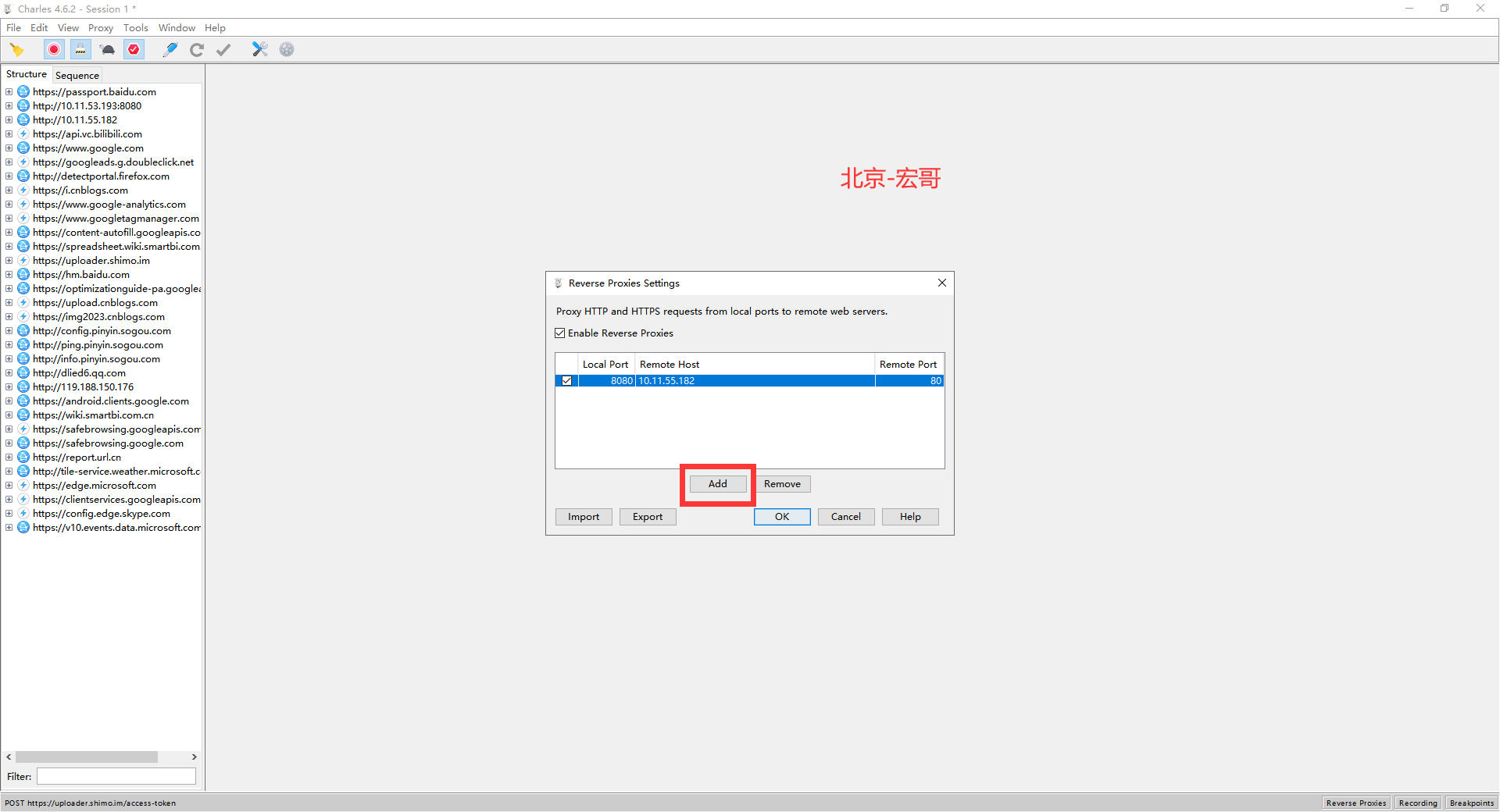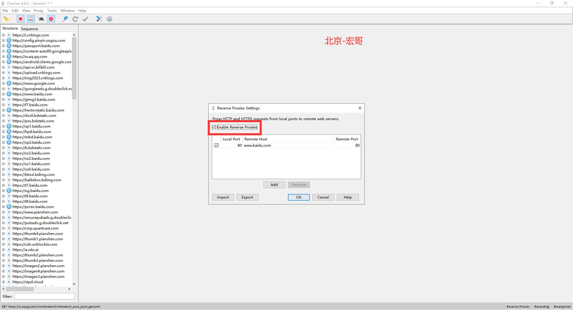 3.选中charles上的"Proxy"-》"Reverse Proxies",进入反向代理设置界面,如下图所示:
