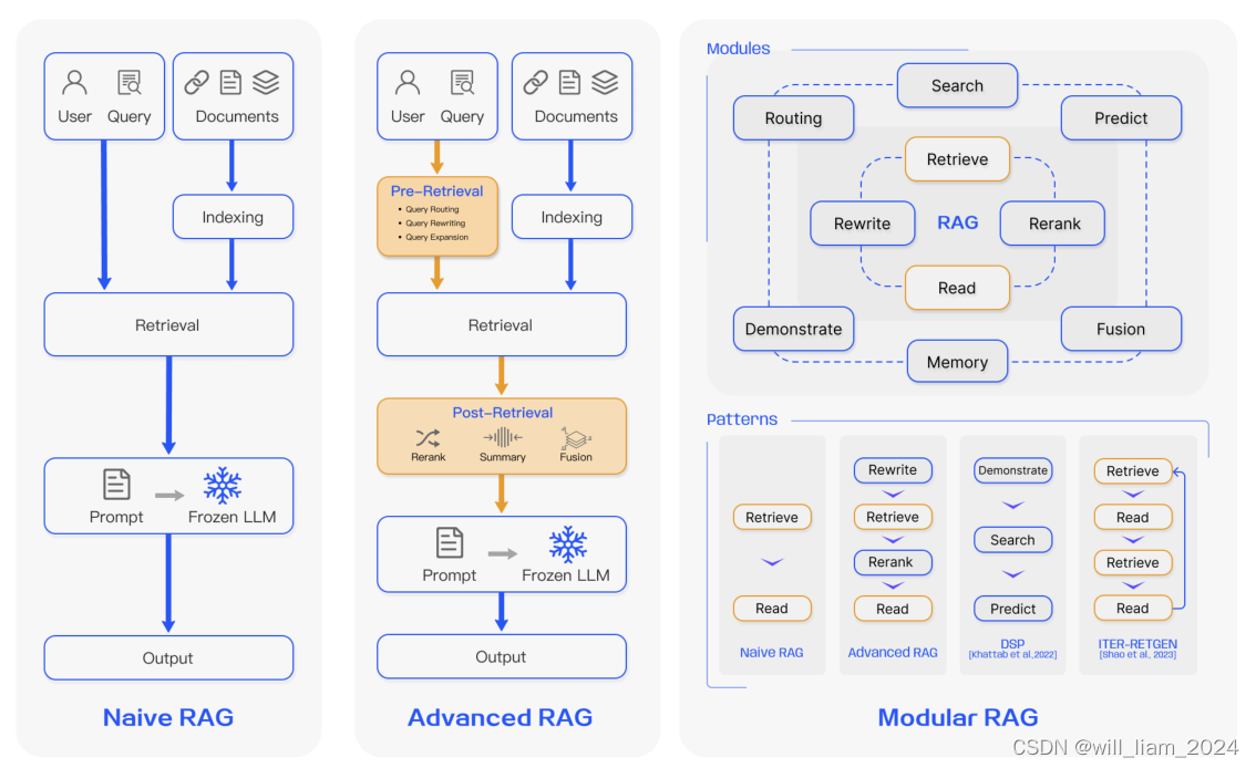 RAG范式与快速搭建套件茴香豆--书生·浦语大模型第二期实战营第三课笔记&作业 包括朴素RAG(Naive RAG)、进阶RAG(Advanced RAG)和模块化RAG(Modular RAG)。朴素RAG:这是RAG最早的方法论,主要包含索引(indexing)、检索(retrieval)和生成(generation)三个步骤。它通过将文档分割成小块,编码为向量,并存储在向量数据库中,以便在接收到用户查询时进行高效的相似性搜索。进阶RAG:为了克服朴素RAG的局限性,进阶RAG引入了特定的改进措施,包括预检索和后检索策略。