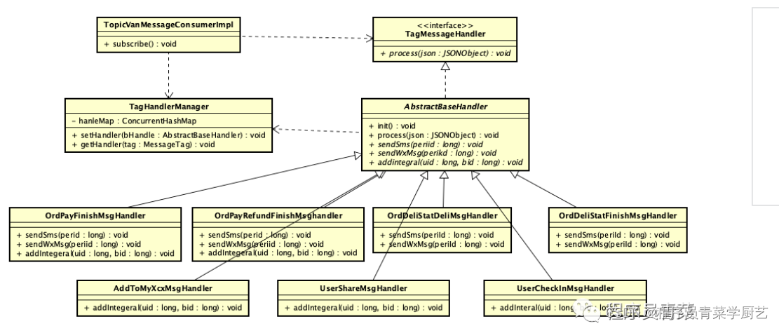 3、模板方法:AbstractBaseHandler定义了模板方法,调用sendSms、sendWxMsg、addintegral抽象方法,封装了具体流程,具体子类去实现,如果不需要该功能就空实现。