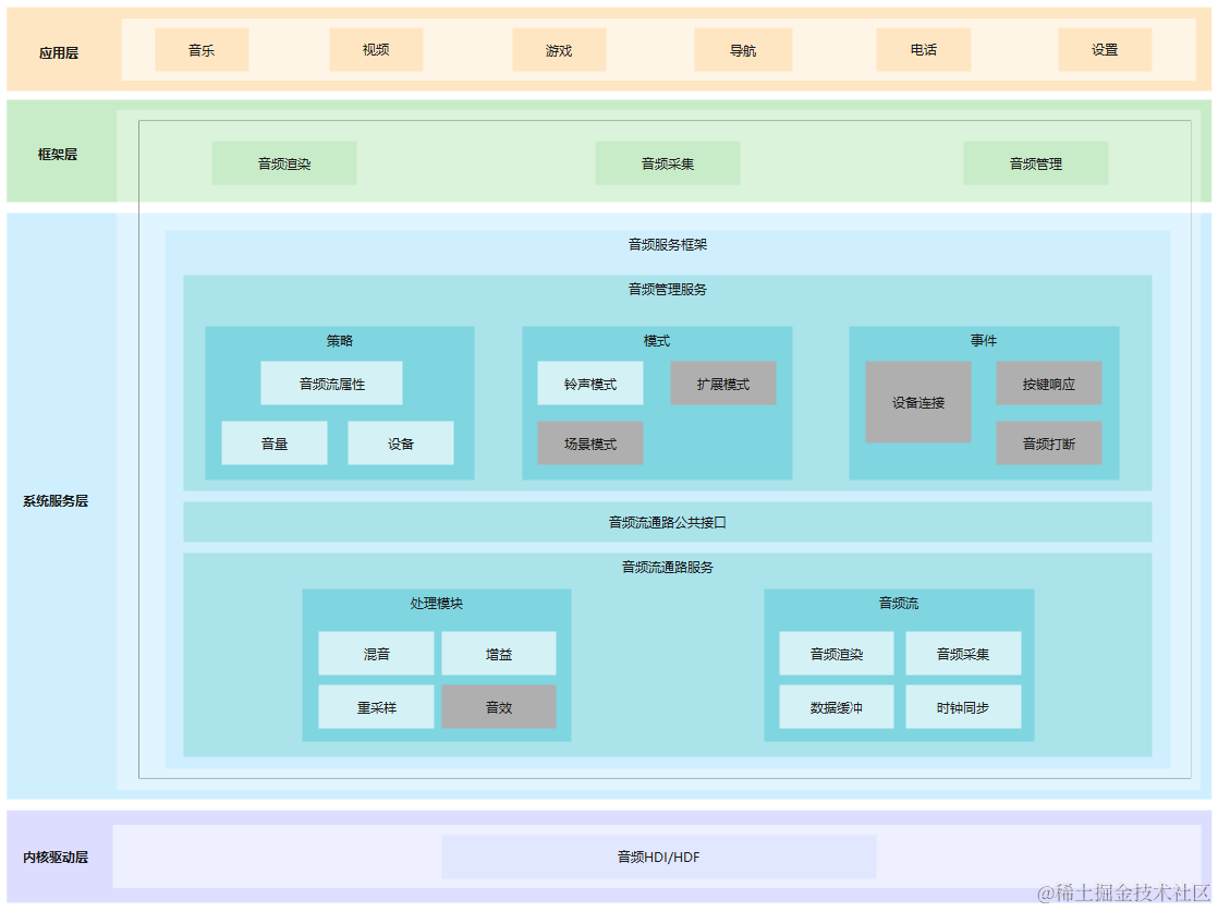 音频组件用于实现音频相关的功能,包括音频播放,录制,音量管理和设备管理。