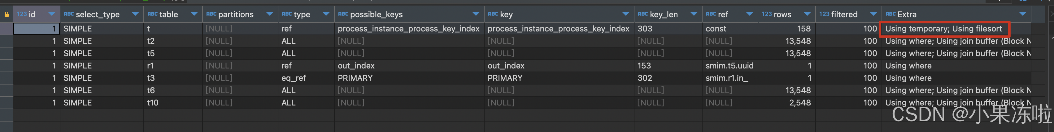 表示当前SQL用到了临时表,当前的SQL性能消耗较大,常见于排序和分组查询