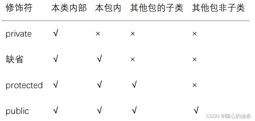1. private 、缺省、protected、public的表格化作用区域