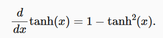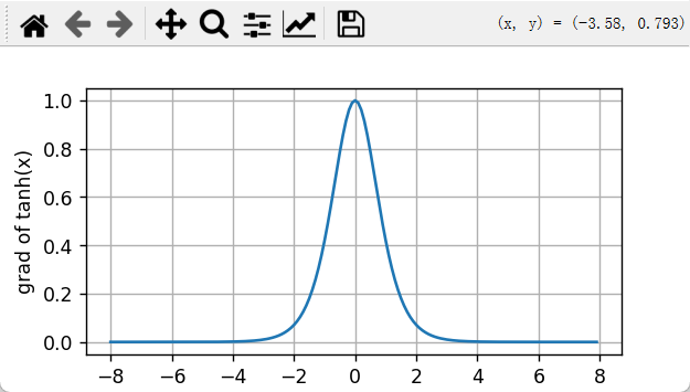 当输入接近0时,tanh函数的导数接近最大值1。 与我们在sigmoid函数图像中看到的类似, 输入在任一方向上越远离0点,导数越接近0。