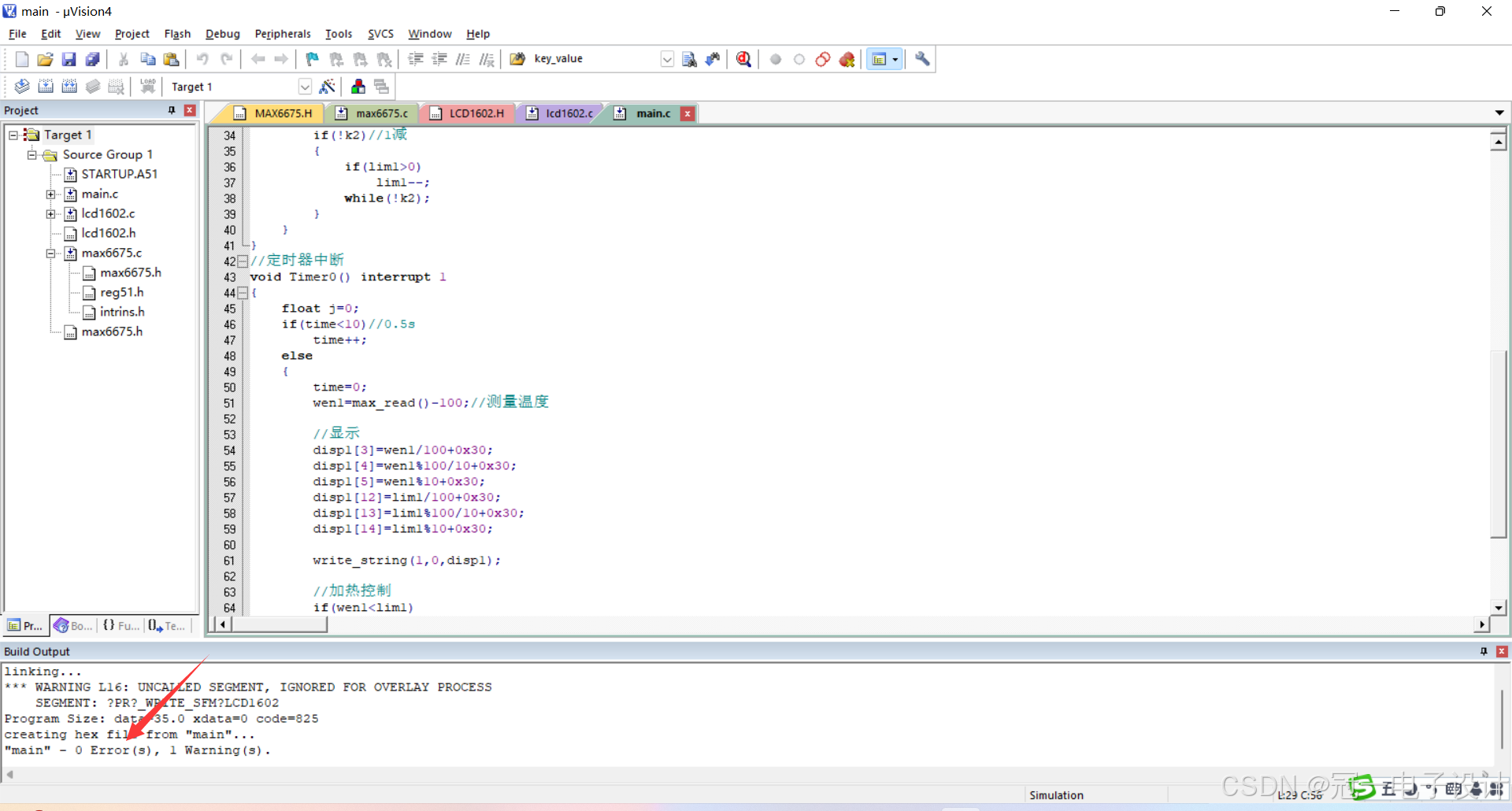 2、通过LCD1602液晶屏显示实时的热电偶温度以及按键设置的温度阈值。