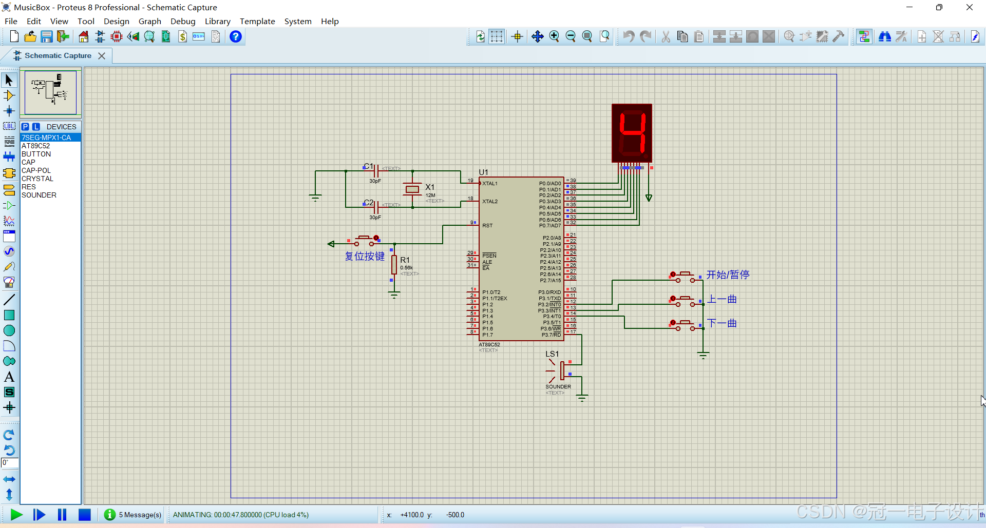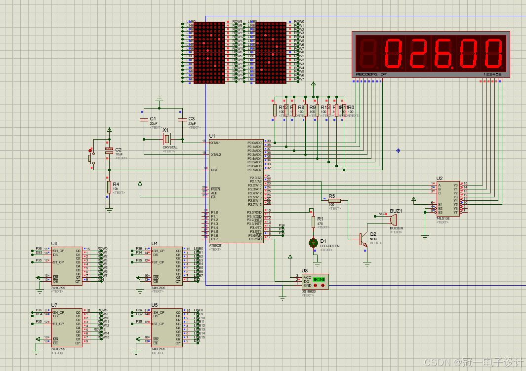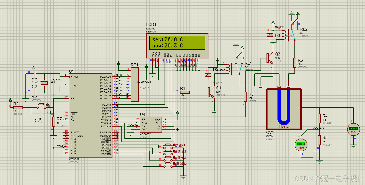 3、采用pt100温度传感器采集电炉丝的温度,通过温度传感器进行温度反馈后控制继电器的开和关的时间来控制电炉丝的温度,使电炉丝温度工作在设定的温度值,达到稳定控制效果。需要完整的资料可以点击下面的名片,找我要资源压缩包的百度网盘下载地址及提取码。毕设帮助、开题指导、技术解答(有偿)见文末。1、本次设计采用51单片机处理数据。2、系统可按键设置电炉丝的温度大小。二、Proteus仿真。