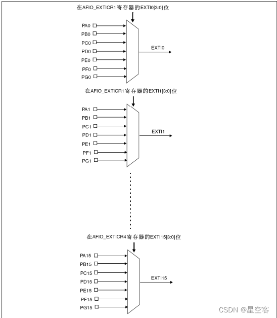 这里简单介绍一下AFIO,它用于管理 GPIO 引脚的复用功能和重映射。AFIO 允许将某些引脚的默认功能切换为其他功能,比如说,外部中断线映射,也就是接下来,我们选择的中断线。还比如说,通过AFIO我们可以复用引脚功能,例如,可以将 UART 的 TX 和 RX 引脚从默认的引脚映射到其他 GPIO 引脚上。接着说我们现在要进行的中断配置,STM32的外部中断的第二步就是中断线的设置,AFIO给出了16个通道给中断,而且就是对应Pin0~15的端口;那么只给出了这么多的通道,而且有GPIOA或GPIOB或GPIOX等这么多外设容易冲突,那么就有个规则:比如,当GPIOA_Pin_1即GPIOA已经占了通道1(通道几对应它的端口几),通道1就已经用完了,那么这些GPIOB或GPIOC啥的GPIOX它们的Pin_1即它们的端口1就不能在选择这个通道作为中断,只能用除了1之外的通道;也可以这么理解,相当于给了16条通道线,每条通道线,对应连接端口0~15即Pin_X(0~15),但是每条线只能选择一个GPIO类型的外设。